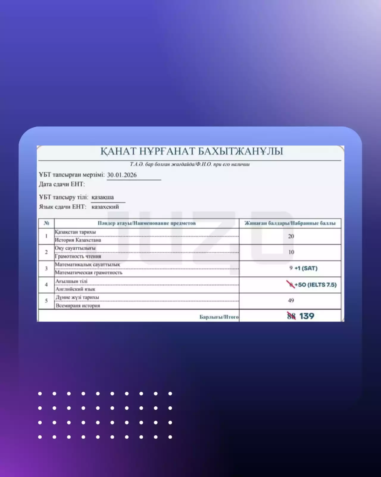 Жақында өткен ҰБТ-ның сынақ тестілеуінен 139 балл жинауым осы ұстанымның дәлелі. Бұл жоғары көрсеткішті іштей лицейде қалыптасқан еңбекқорлықтың, олимпиадалық дайындықтың заңды жалғасы ретінде бағаладым, – дейді Нұрғанат Бақытжанұлы.